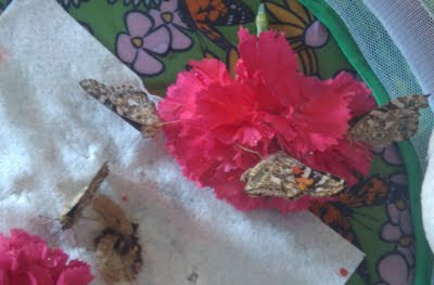 Right on schedule we had butterflies breaking out of their chrysalids. First one, then another, then another, and one more....Out of five we have four butterflies flitting around our butterfly habitat. One chrysalid is left. He was a late starter compared to the others, but we expect his arrival on Wednesday. We'll enjoy them for a bit longer then let them go as per our instructions.
