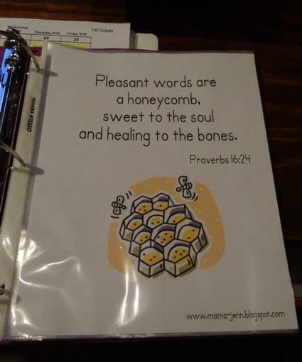 I found on Mama-Jenn's blog these proverb sheet printables, created to go specifically with MFW 1st grade. So, we print them out and are creating a binder with them. They are all placed in sheet protectors so they will easily last for our entire 1st grade year. Every day we say the new verse and 2 or 3 times a week we go back over all the memory verses from the beginning of the year. Here is a picture of Mama Jenn's picture for week #5. Caleb laughs at this one every time!